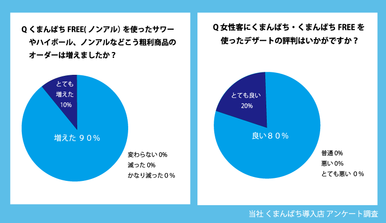 当社が果実酒を導入した飲食店様の実に10割が果実酒の導入がお店にとってプラスになったと回答されています。日本酒や焼酎の銘柄や味の違いなどはライトユーザーにはわかりにくですが果実酒は見た目のインパクトが強く、ドリンクメニューの中でも目を引き、お酒の強くない方からの注文も多いとの回答もいただきました。